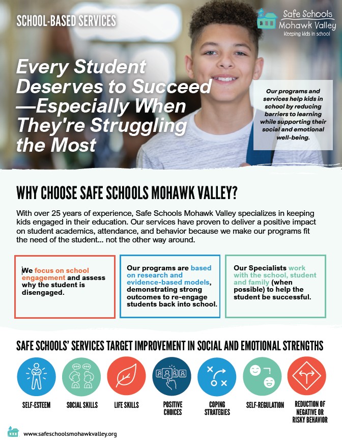 Safe Schools Mohawk Valley is a proud partner in the Utica City School District System of Care. We help students overcome barriers to learning, strengthen social-emotional well-being, and stay connected to school.
